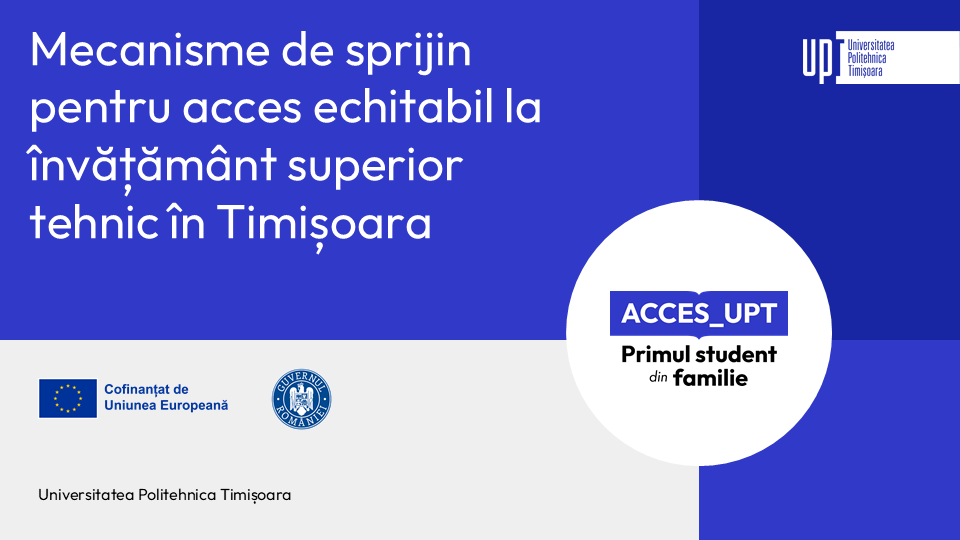 Dacă ești student în anul I la una dintre Facultățile de Automatică și Calculatoare, Construcții, Electronică, Telecomunicații și Tehnologii Informaționale, Inginerie Electrică și Energetică, Mecanică sau Științe ale Comunicării și vrei sprijin pentru a-ți urma studiile și a-ți crește șansele de reușită la facultate, acum e momentul să te înscrii în proiectul ACCES_UPT – Mecanisme de sprijin pentru acces echitabil la învățământ superior tehnic în Timișoara.